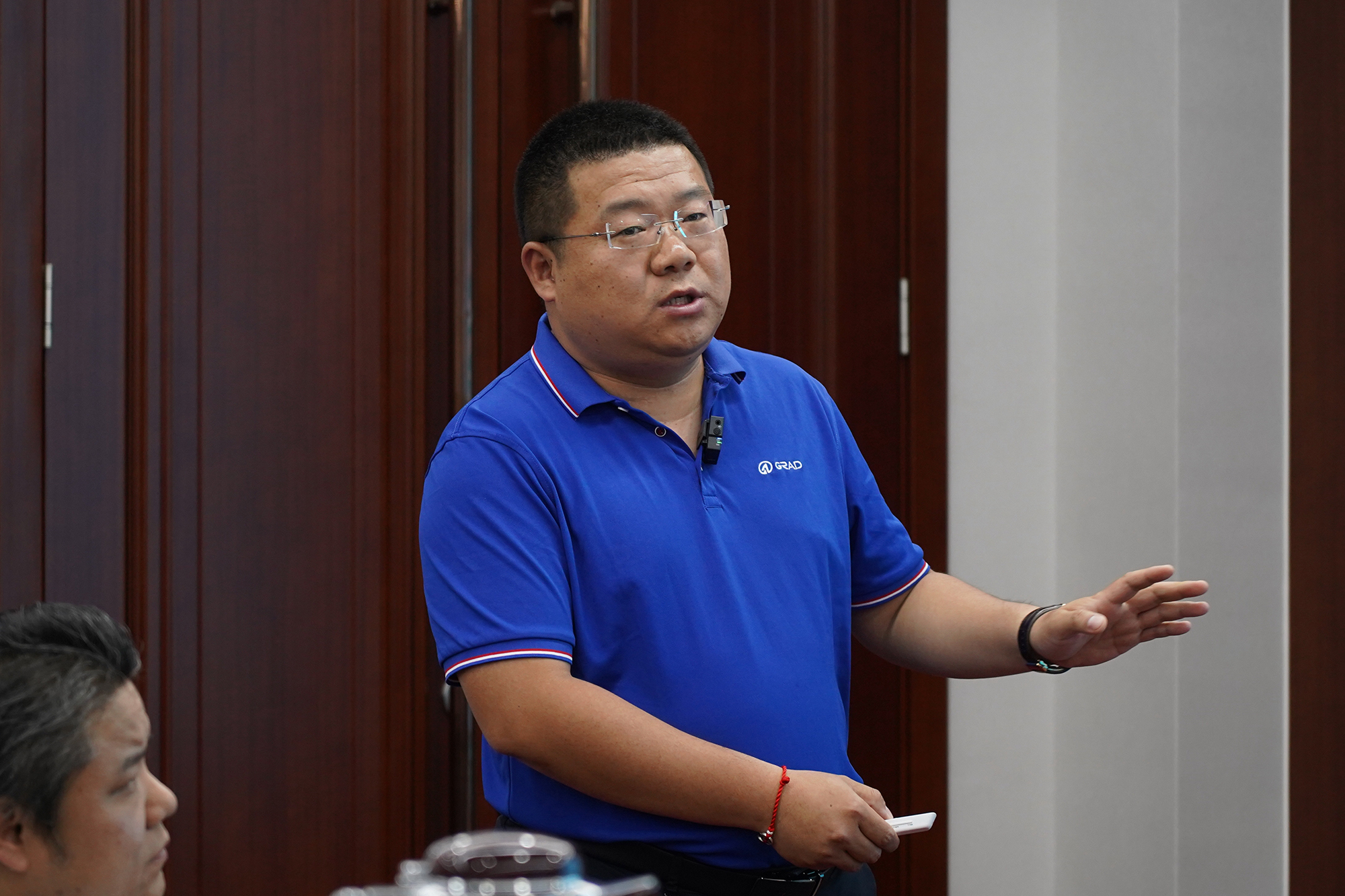 格瑞德销售二部部长杨家兴向现场及线上参与的业务菁英分享“借船出海”的具体行动路径,并精准指出间接出口项目操作中相关的风险点,从操作层面为业务菁英涉外项目规避风险保驾护航。